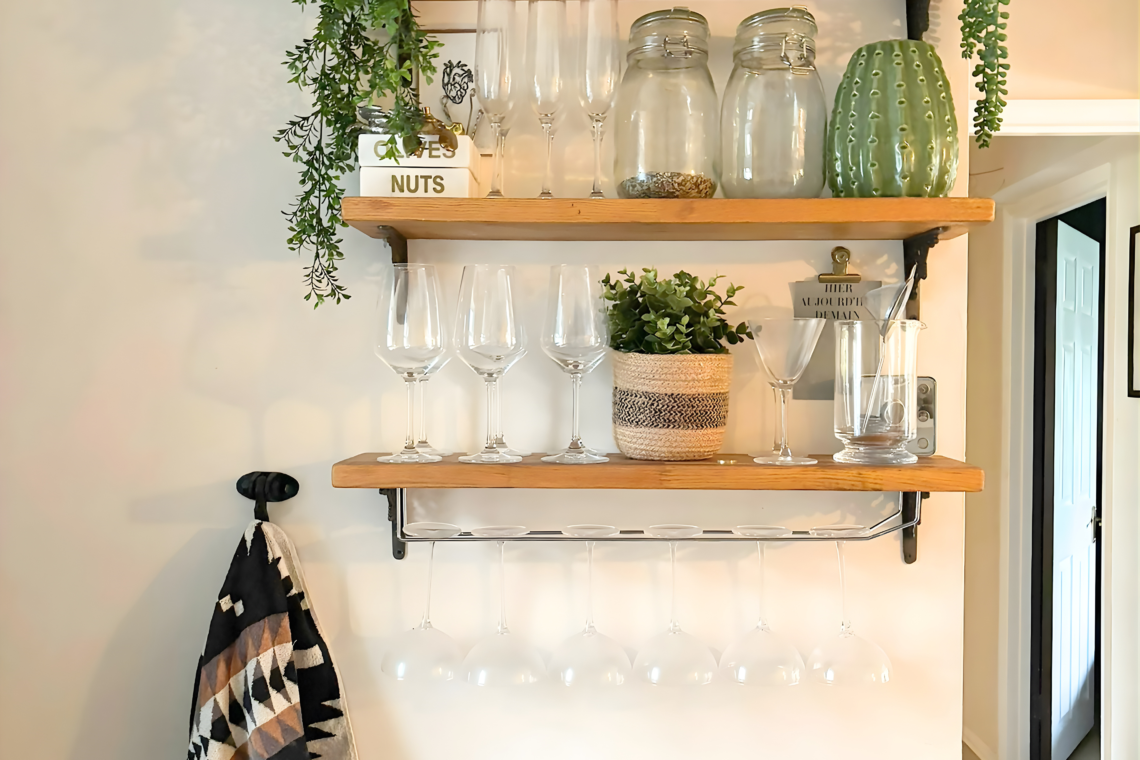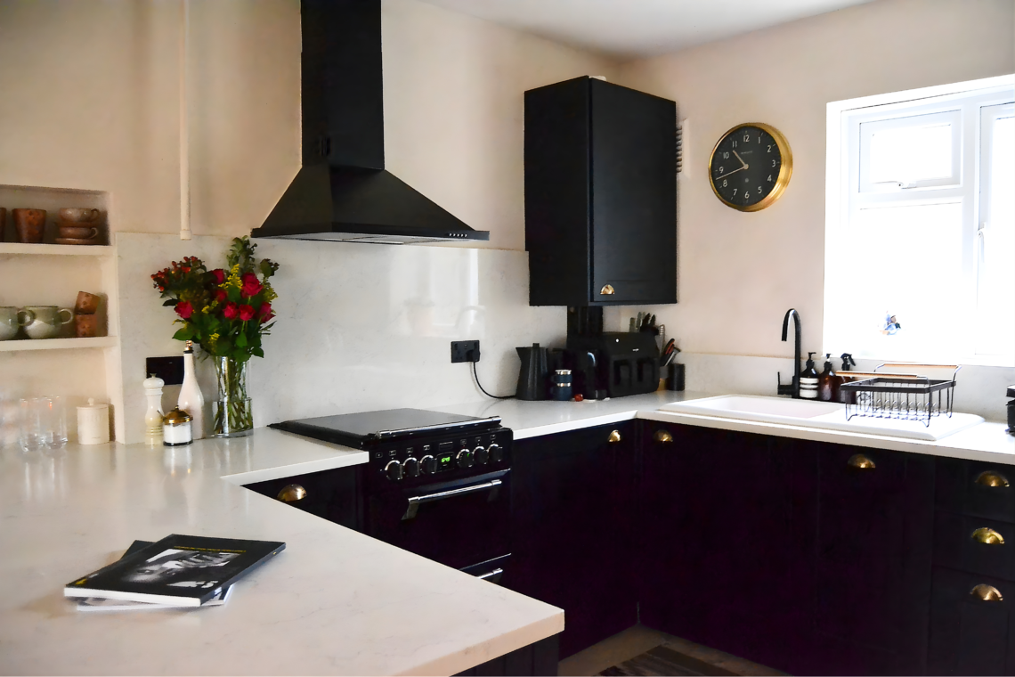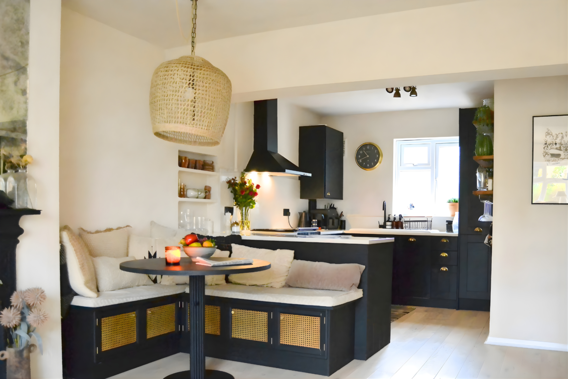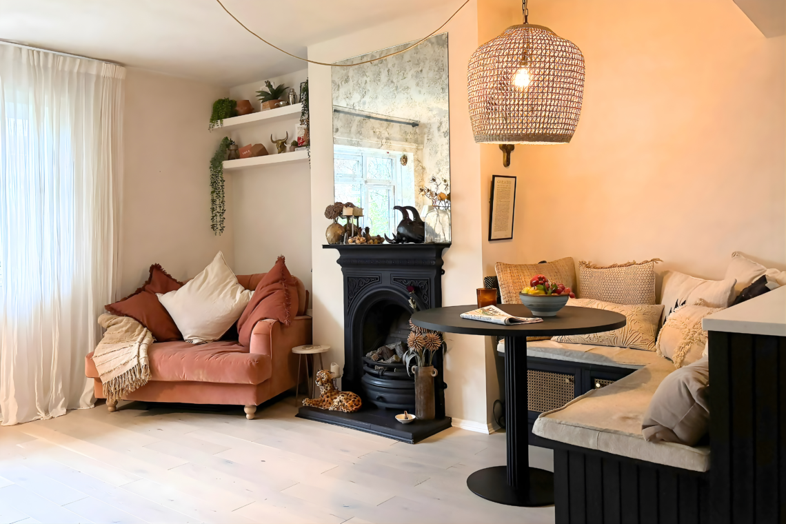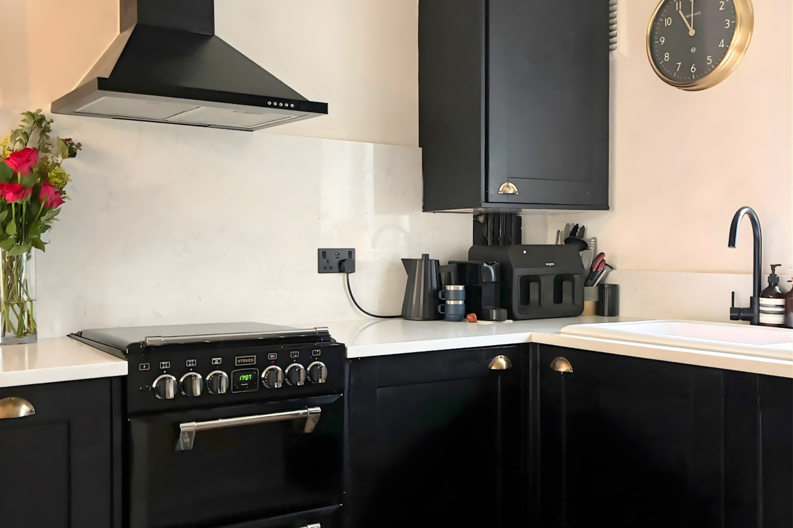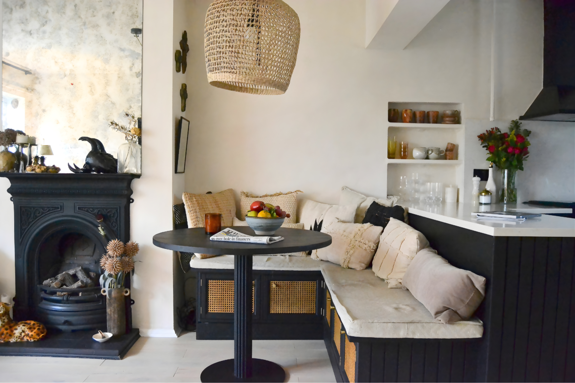 Then, as you turn into the main living area, you’ll step into a spacious, light-filled room with a beautifully carved fireplace and refined, country-house-inspired furnishings. The standout built-in banquette seating catches your eye first, adding both character and comfort. A 55-inch Samsung Smart TV sits opposite, perfect for relaxed evenings in. The fully equipped kitchen, designed in an industrial style with black and wood tones, has everything you need to cook at home.