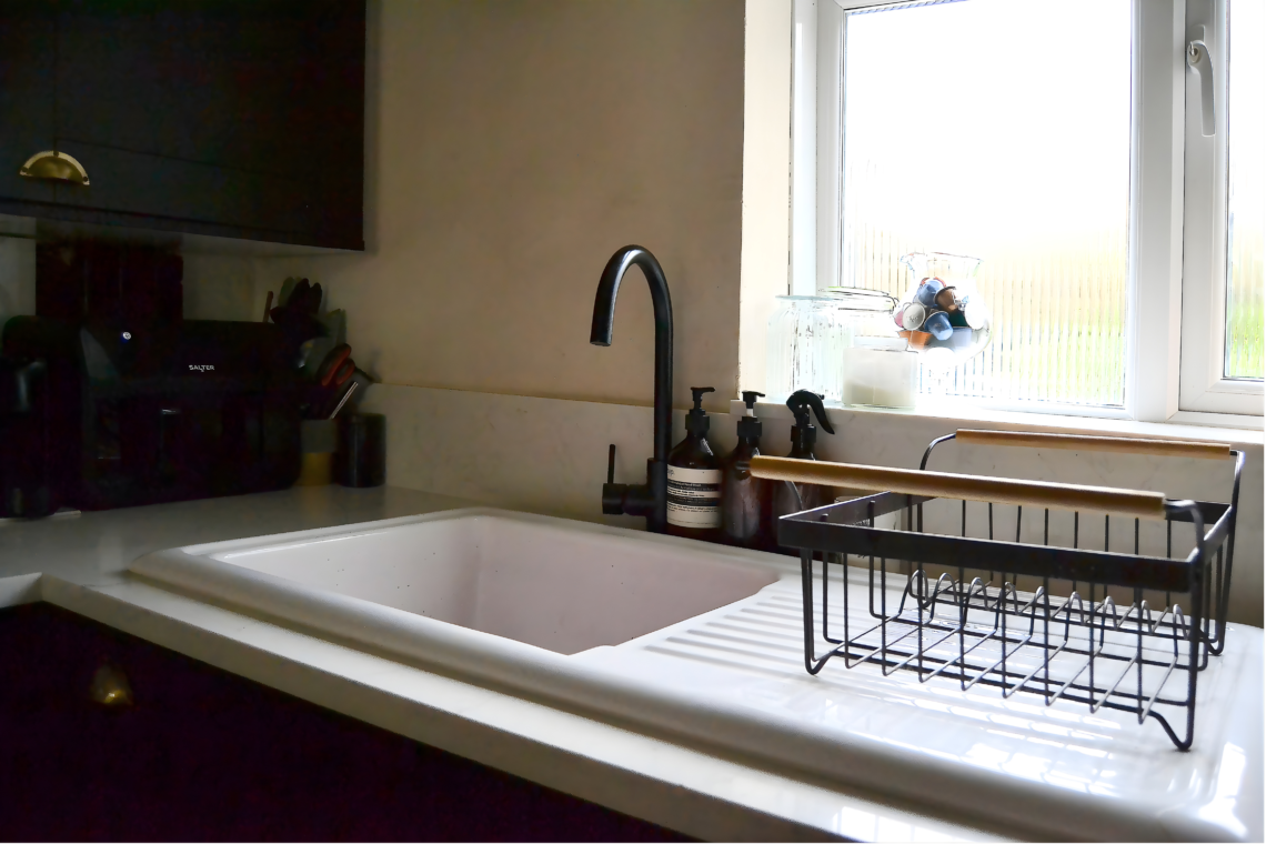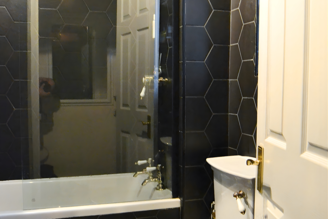 As you pass through the secure shared courtyard gate, you’ll find your own little garden area on the left before stepping inside the flat. Once you enter, there’s a welcoming hallway where you can leave your coats and shoes. Immediately to your right, you’ll find a sleek, dark-toned bathroom with a modern shower and all the essentials.