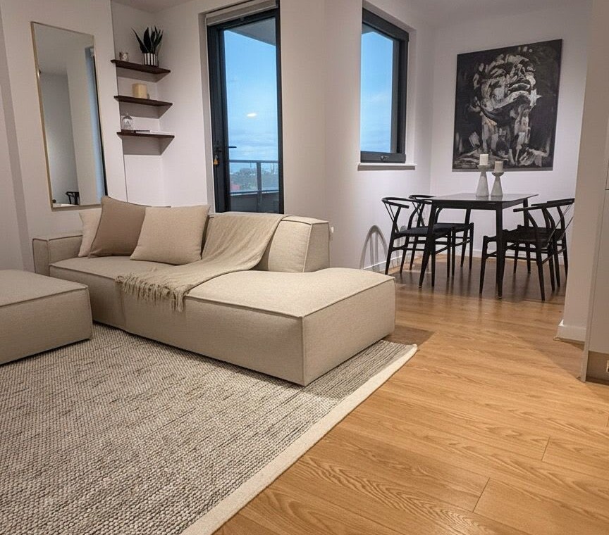 The living room has a large, comfortable sofa with a chaise lounge, making it a great spot to relax and watch Netflix after a long day. From here, you can step out onto the balcony to catch the sunset and, later on, enjoy the beautiful city lights as London comes alive at night.