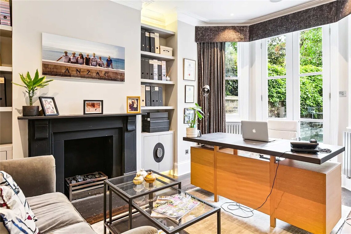 As you walk through the grand front door, on your left you’ll find a large living area with high ceilings, elegant furnishings, and a cosy fireplace that invites you to unwind. On the right, a spacious dining area and a fully equipped kitchen open onto the beautiful back garden. Also on this floor is one of the two home offices, featuring an executive desk and a cosy seating area.