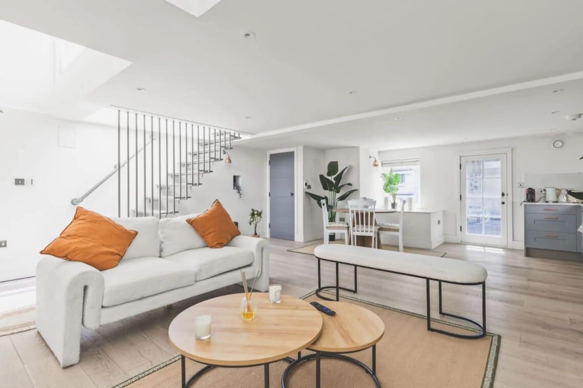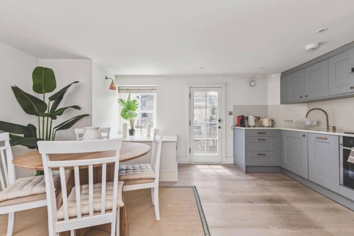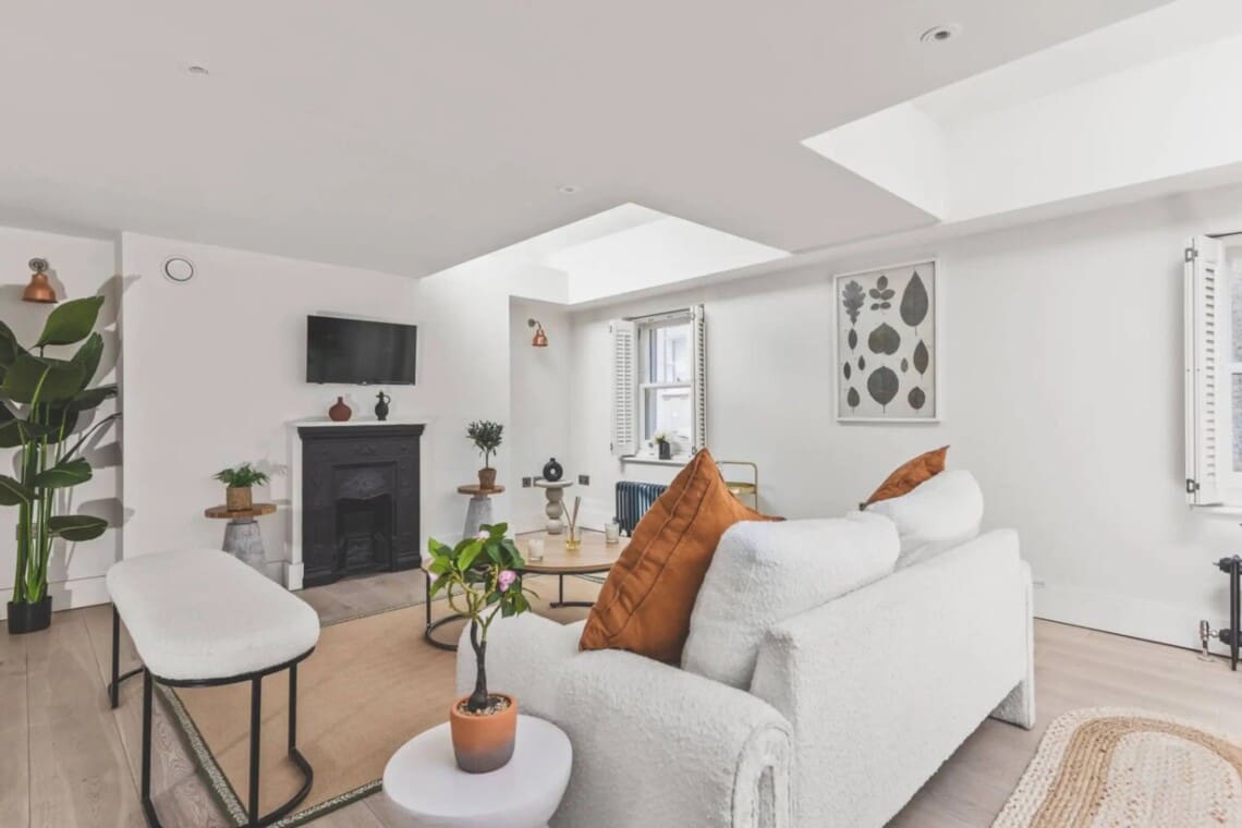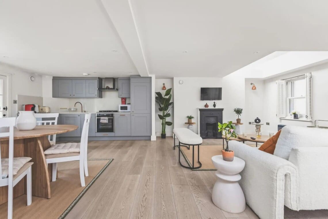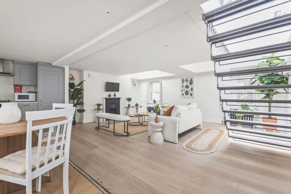Head up another set of stairs to the top floor, where you’ll step into a bright, open-plan living space. Skylights fill the room with natural light, and you’ll have a fully equipped kitchen, a cozy dining area, and a comfortable lounge with some charming original features like the cast iron chimney. It’s a relaxed and welcoming space where you can cook, dine, and unwind.