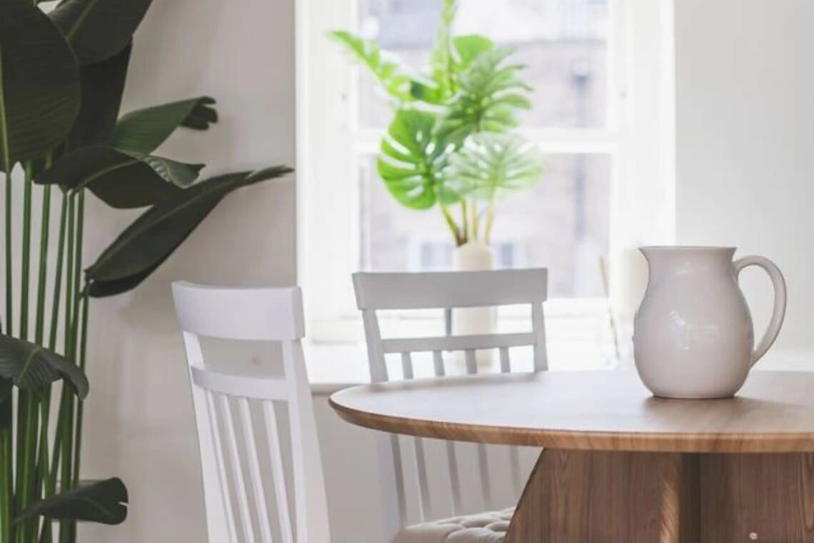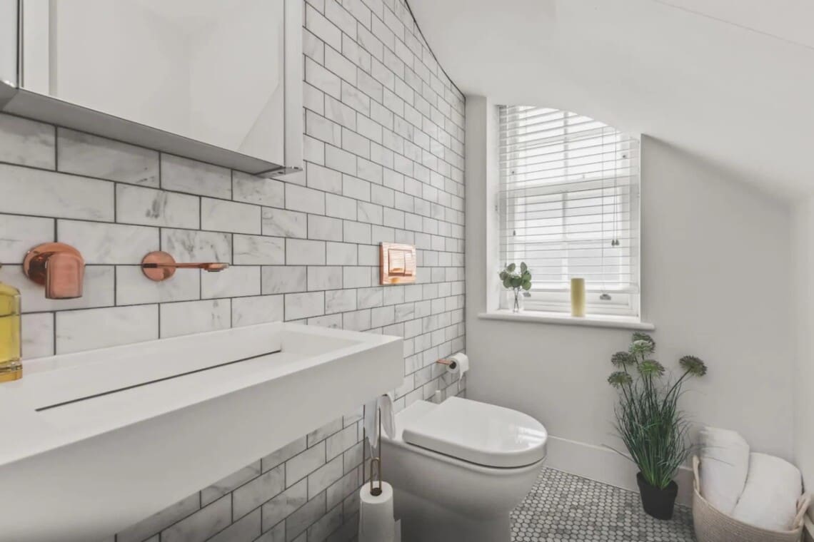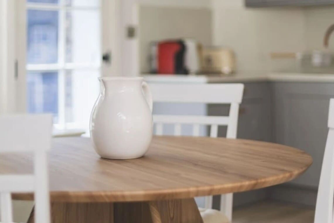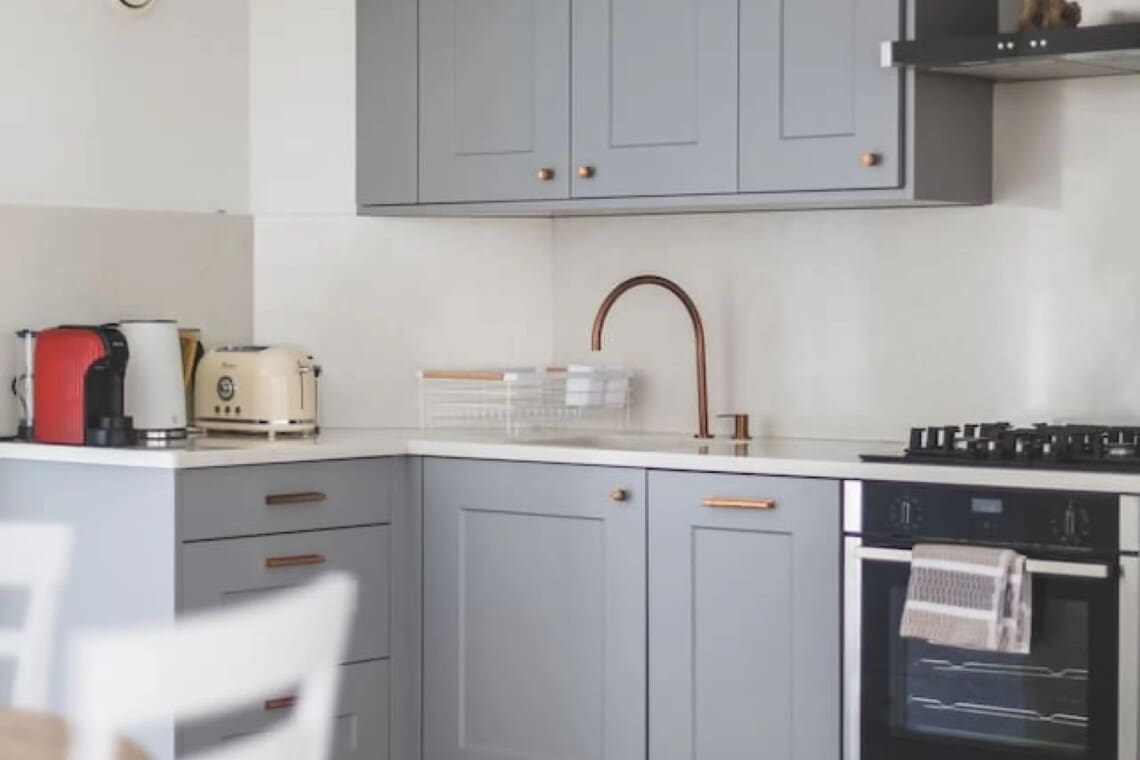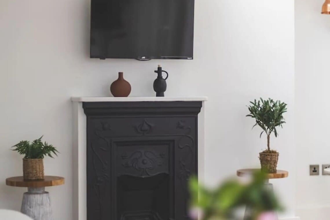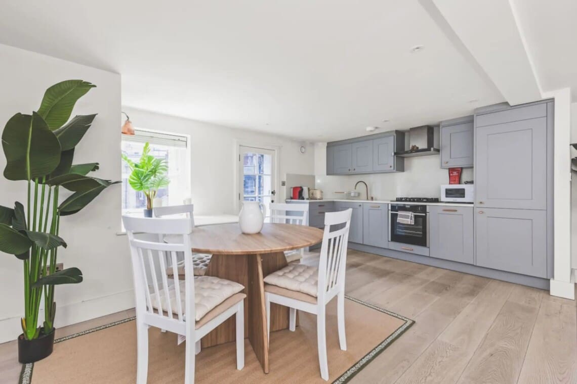 Head up another set of stairs to the top floor, where you’ll step into a bright, open-plan living space. Skylights fill the room with natural light, and you’ll have a fully equipped kitchen, a cozy dining area, and a comfortable lounge with some charming original features like the cast iron chimney. It’s a relaxed and welcoming space where you can cook, dine, and unwind.