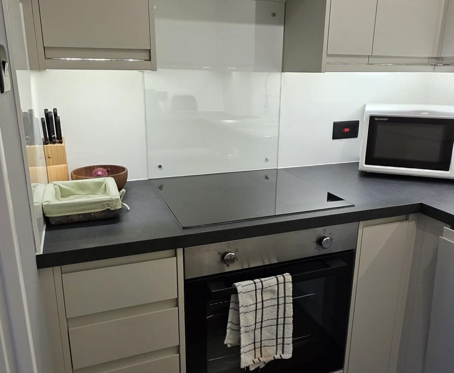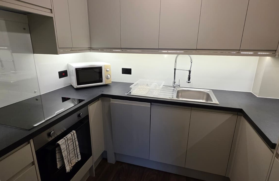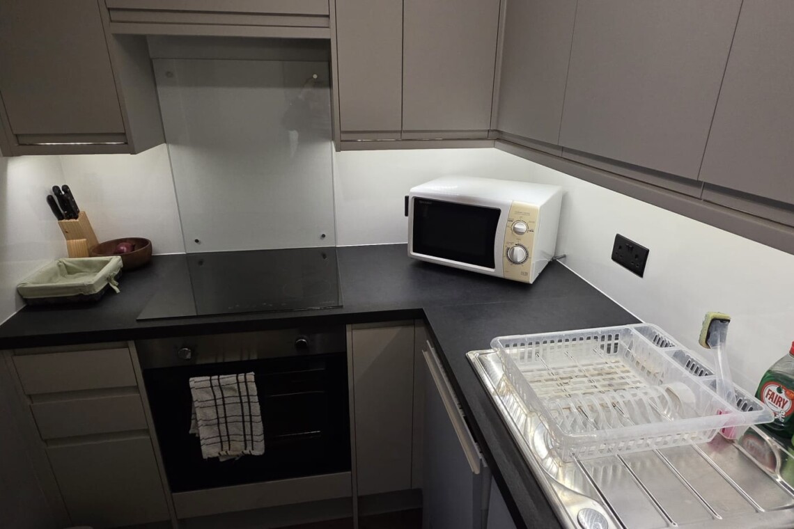 The living area flows seamlessly into a fully equipped contemporary kitchen, complete with everything you need for cooking at home, whether it’s a quick breakfast or a relaxed evening meal.