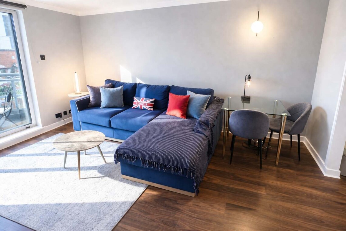 As you enter the apartment, you’re welcomed into a bright and modern open-plan living area, thoughtfully designed with comfort and functionality in mind. The space features a comfortable sofa and Smart TV — perfect for relaxing after a day exploring the city.