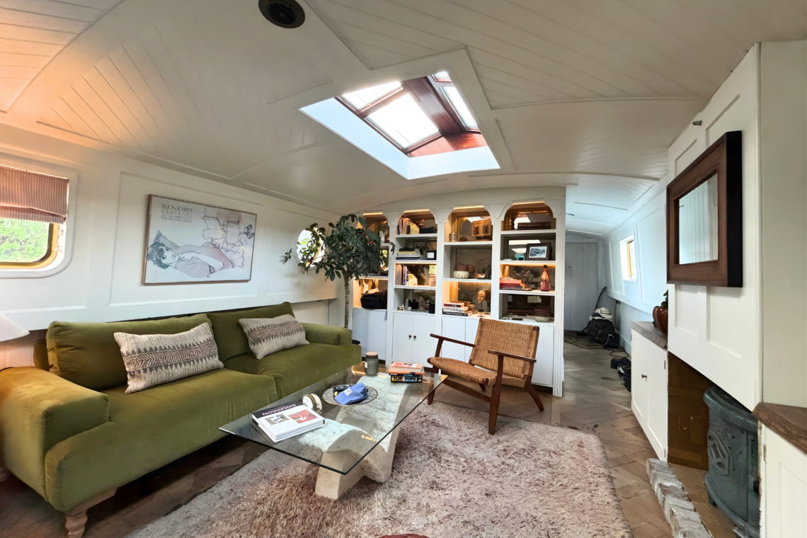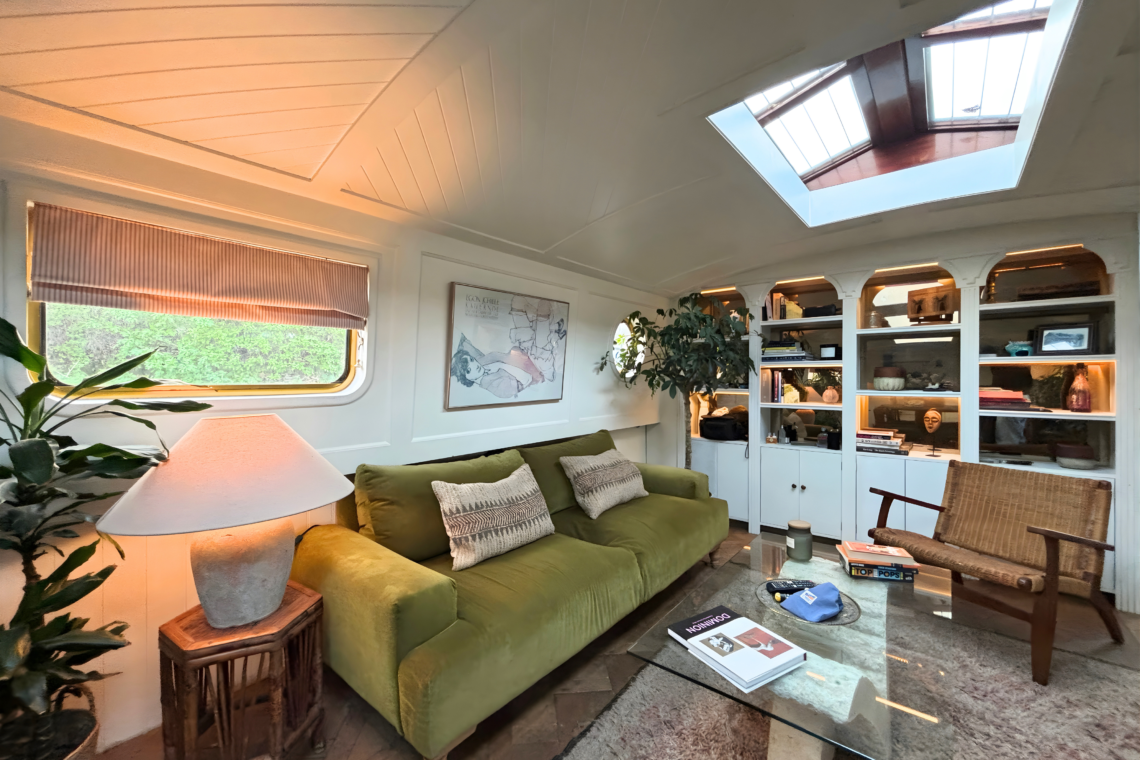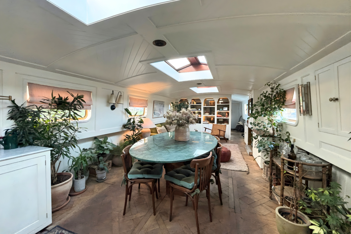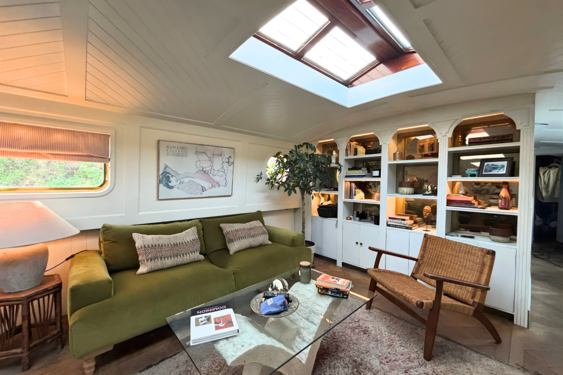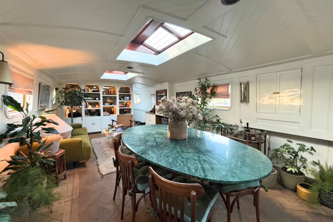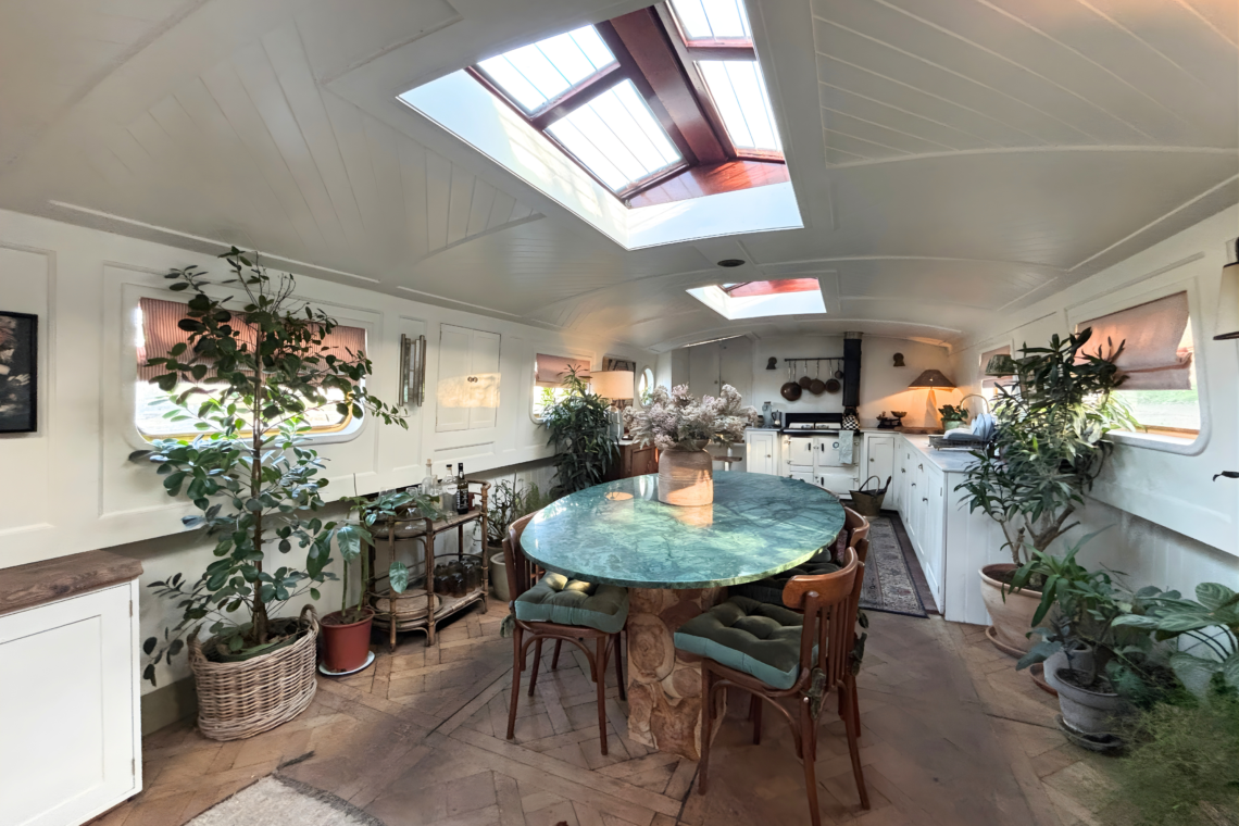As you step aboard, a set of small double doors leads you down a couple of steps into the main living quarters of the boat, beginning with a beautifully restored kitchen, followed by a dining and lounge space.
