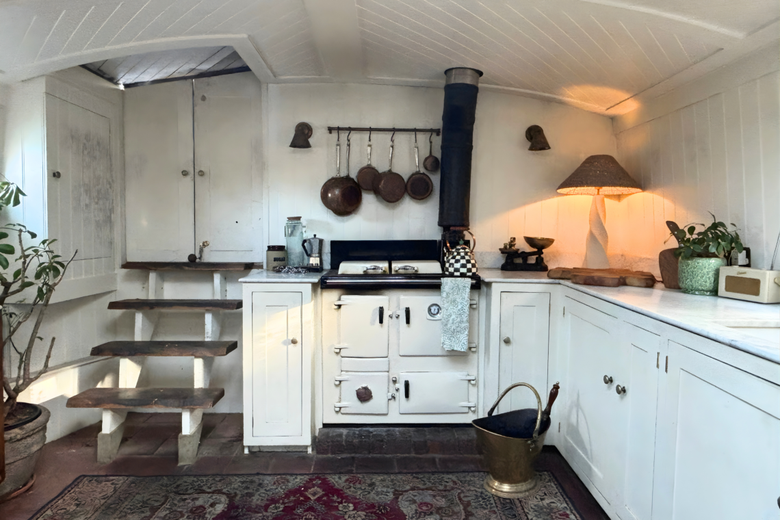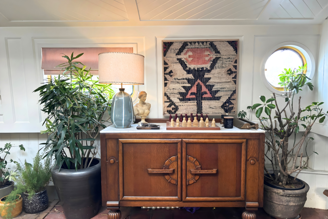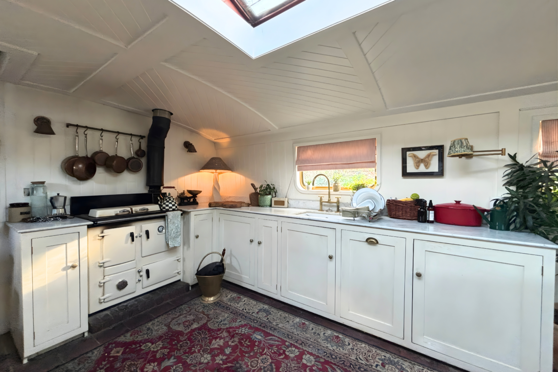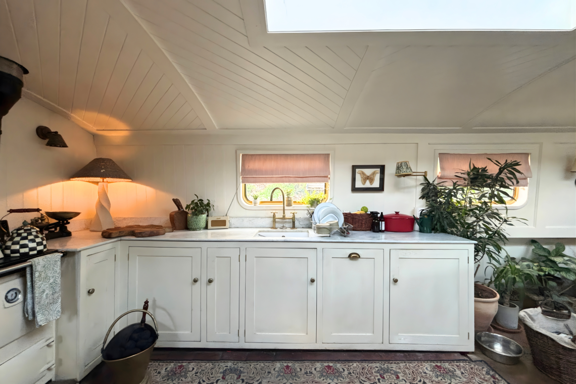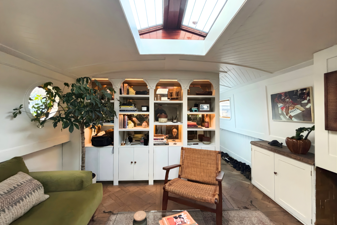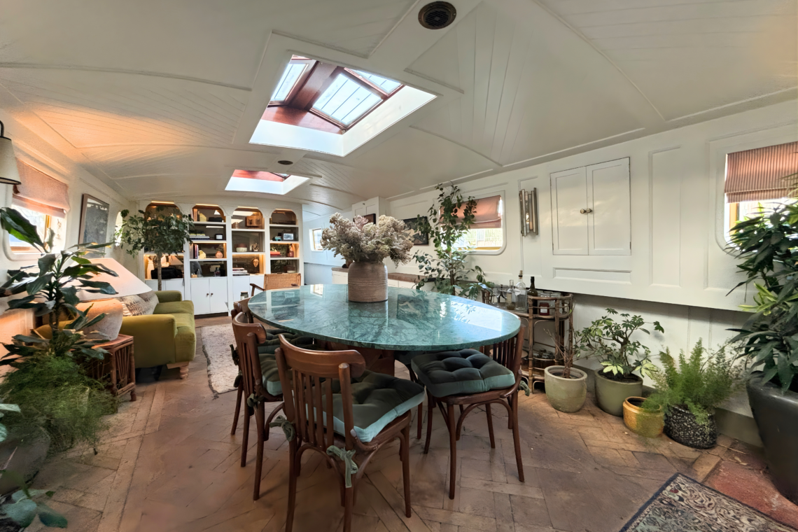 As you step aboard, a set of small double doors leads you down a couple of steps into the main living quarters of the boat, beginning with a beautifully restored kitchen, followed by a dining and lounge space.