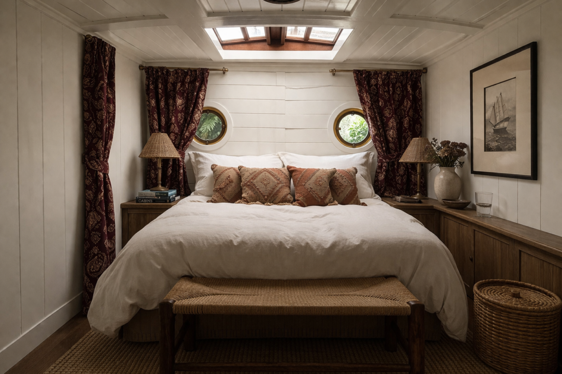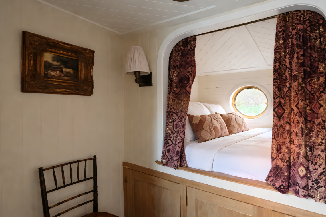 Continuing towards the bow, you’ll find the sleeping quarters. The first cabin on the left features a raised double bed, nestled into a cocoon-like nook. Next is the bathroom, fitted with a shower, sink, and an eco-friendly compost toilet. At the bow of the boat, the main cabin offers a peaceful retreat with a queen-size bed and wardrobe space, creating a calm and comfortable place to rest.