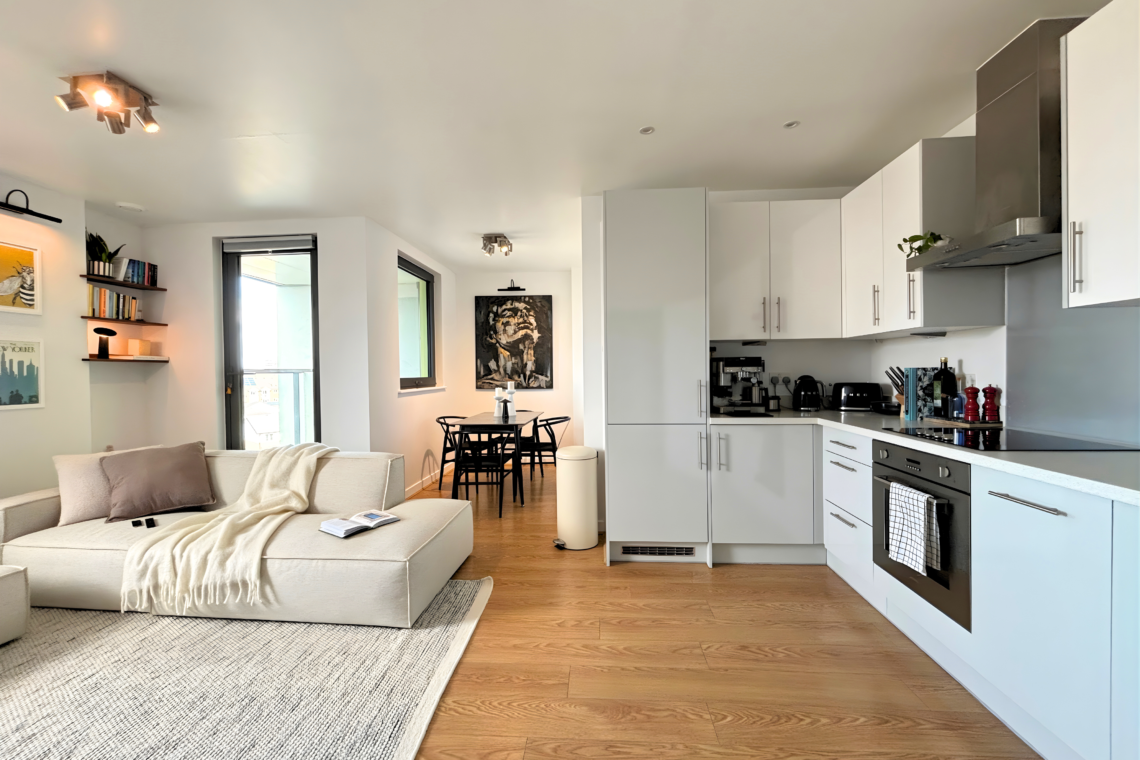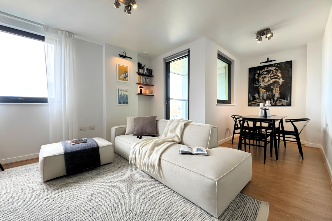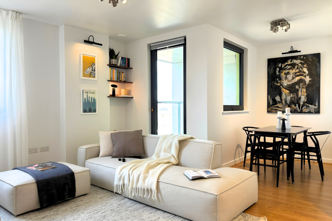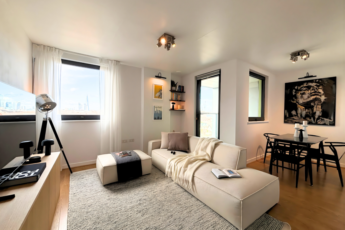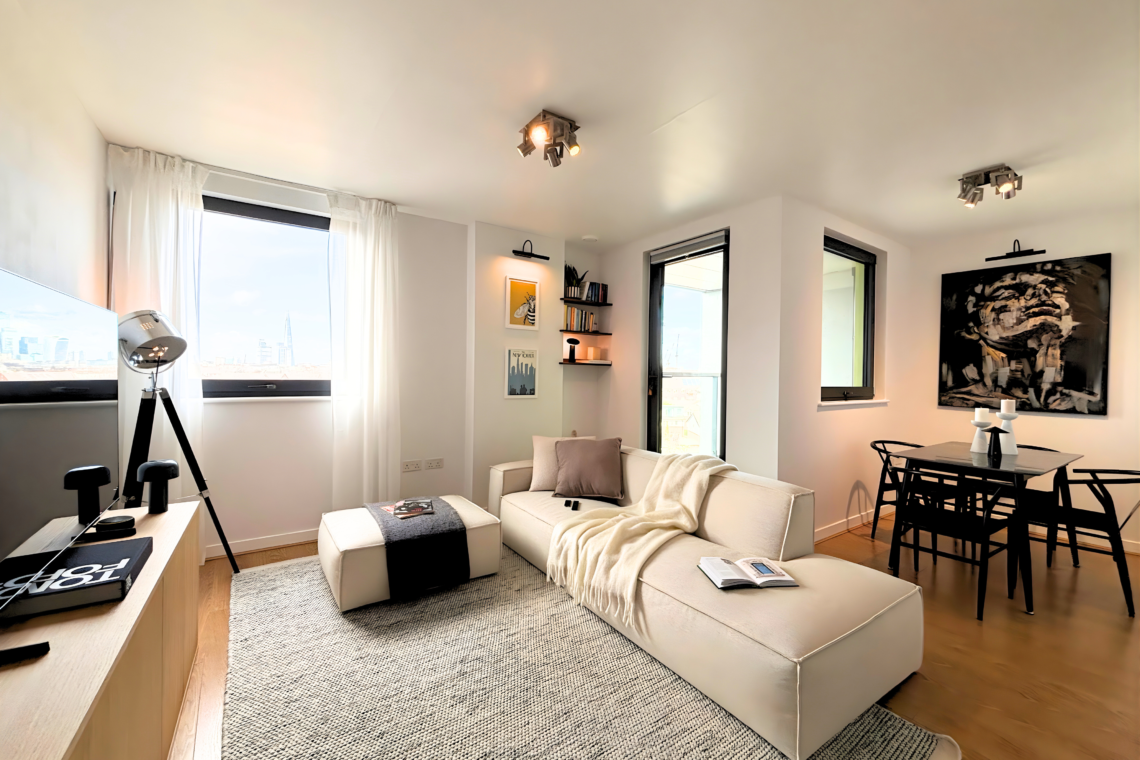 The living room has a large, comfortable sofa with a chaise lounge, making it a great spot to relax and watch Netflix after a long day. From here, you can step out onto the balcony to catch the sunset and, later on, enjoy the beautiful city lights as London comes alive at night.