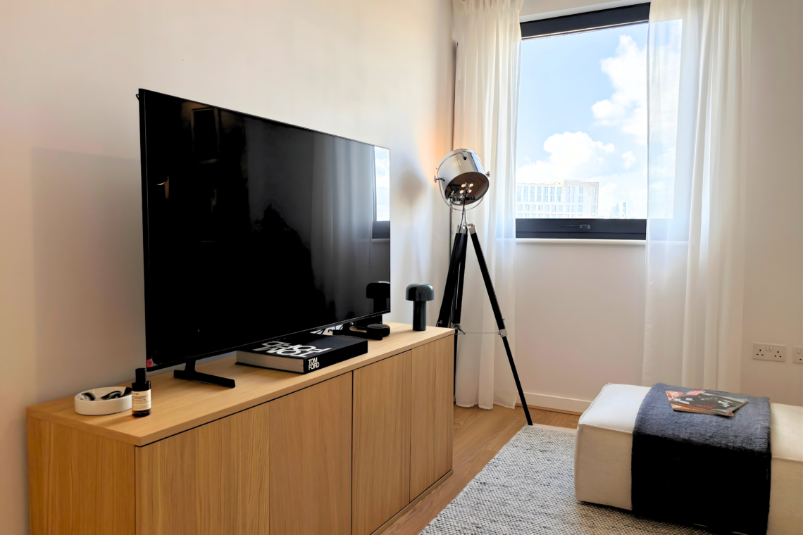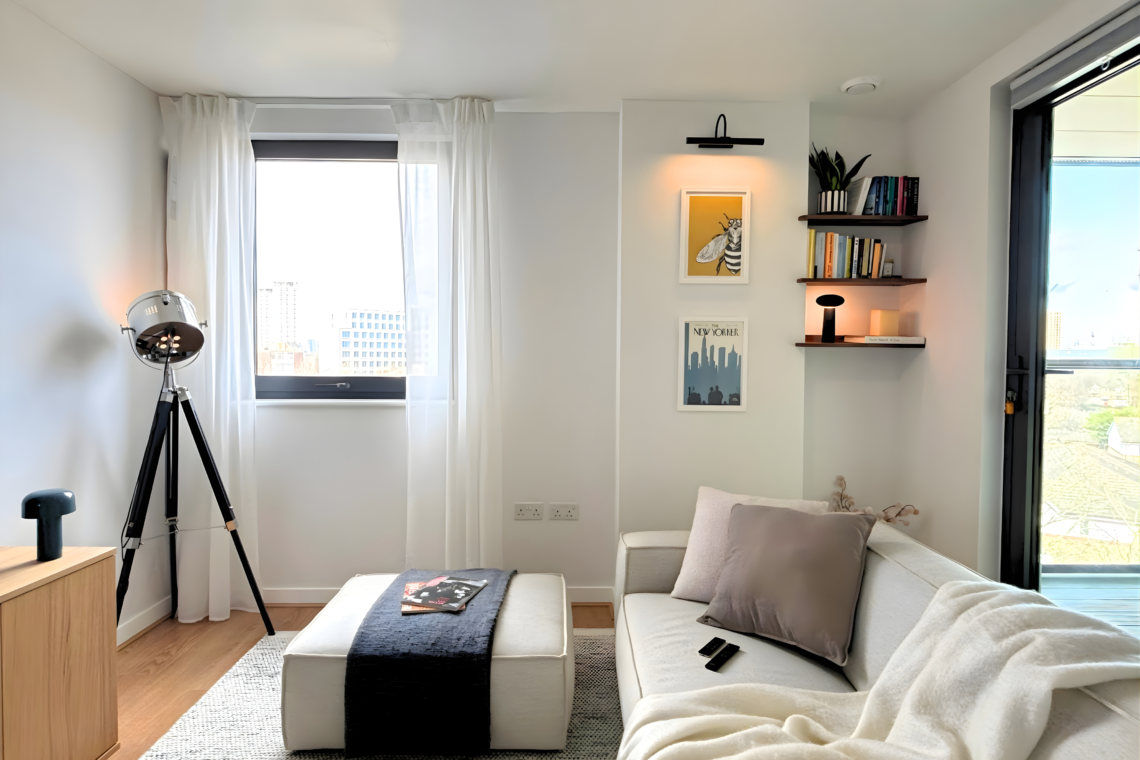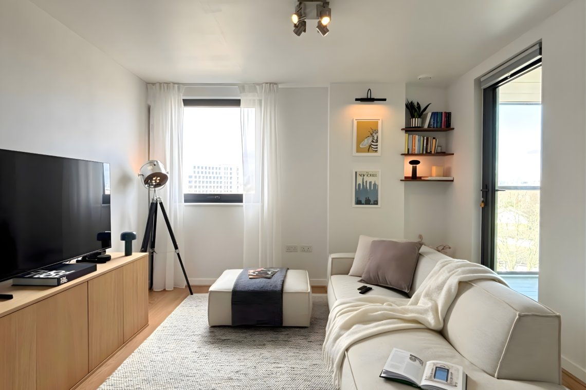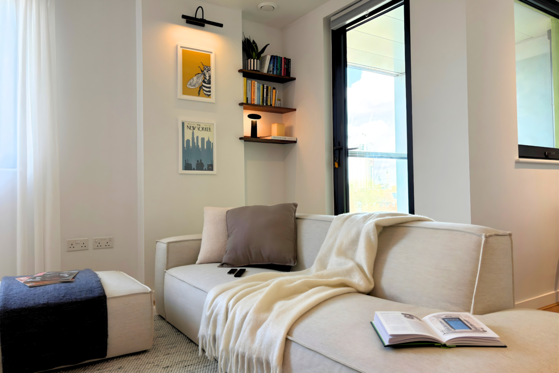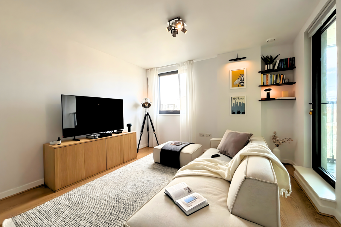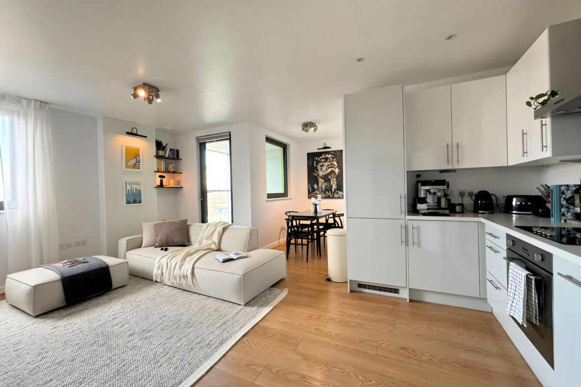 The living room has a large, comfortable sofa with a chaise lounge, making it a great spot to relax and watch Netflix after a long day. From here, you can step out onto the balcony to catch the sunset and, later on, enjoy the beautiful city lights as London comes alive at night.