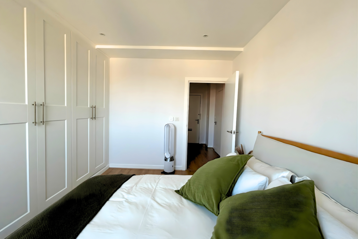 A few steps further, the apartment opens into a bright, open living area. The kitchen is modern and fully equipped, with everything you need, from a coffee machine to an air fryer, whether you’re cooking a meal or just making your morning coffee.