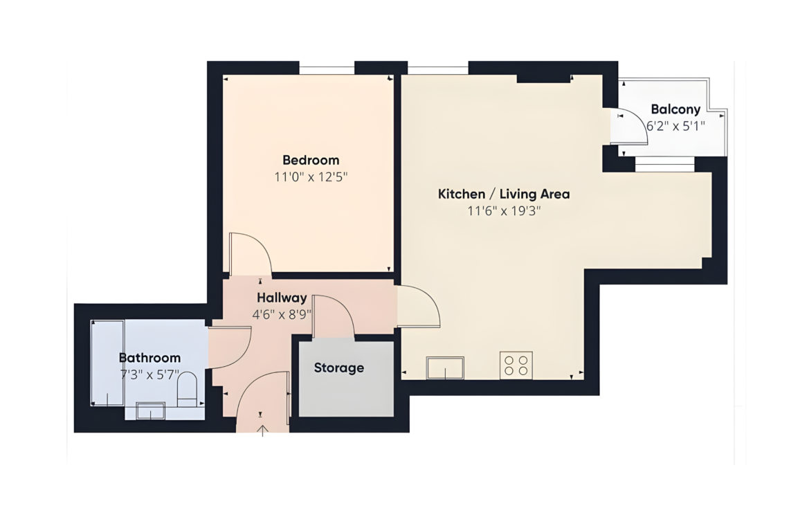 Step inside and you’ll find a cozy hallway where you can leave your coat and settle in. Straight ahead is the bedroom, with a comfortable king-size bed and views of the city skyline. Just around the corner is a spacious bathroom with a bathtub and shower, perfect for winding down after a day out.