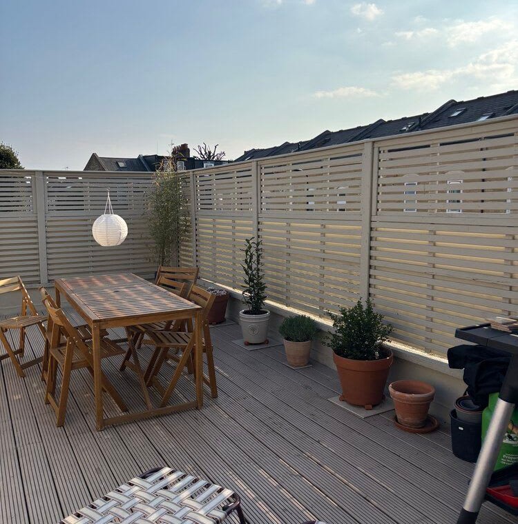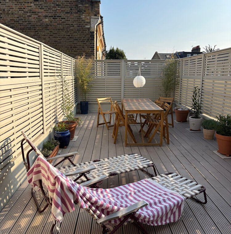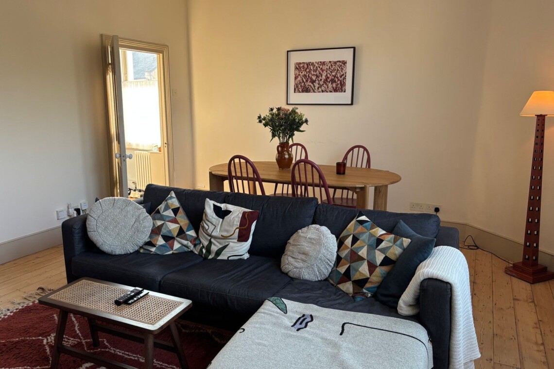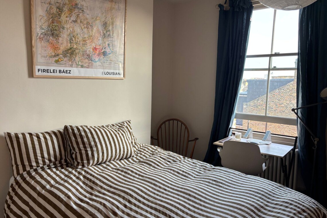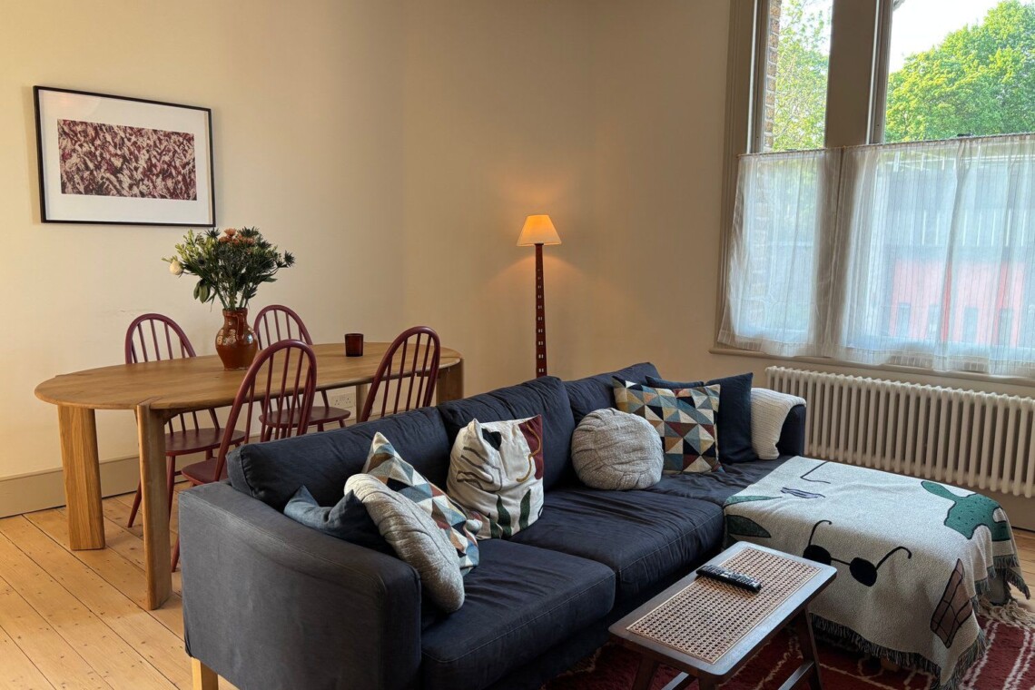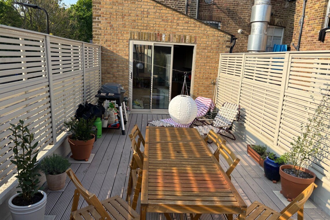 Enter through the private street-level entrance and head upstairs to the first floor, where a warm wooden kitchen opens directly onto the beautiful, sun-filled terrace. A few more steps lead to a spacious living and dining area, along with a bathroom with both bathtub and shower. On the top floor, you’ll find an expansive master bedroom with a luxurious super king bed, plus a second bedroom with a comfortable double and desk, with views over the London skyline.